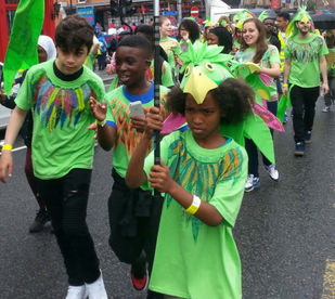 Acton Carnival 2017. This year we took inspiration from parrots and other birds of paradise. Young people help to make the costumes and lanterns and danced and drummed along the parade route.